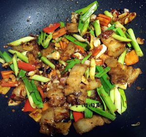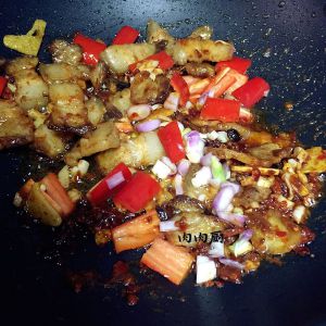 锅中放油,下干辣椒五六个爆香,下一勺郫县豆瓣小火炒出红油,放三四颗冰糖,炒化,放入肉片翻炒上色,放料酒。