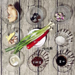 食材:五花肉300g 豆瓣酱30g 豆豉15颗 花椒20颗 葱头6个 蒜苗4根 红椒1个 白糖5g 姜3大片 大蒜4瓣 酱油20g 料酒10g