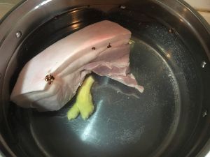 首先,我们需要一块五花肉。洗干净后不用切,整块扔到水中煮熟。锅里倒入料酒去腥,没有料酒的童鞋也可以用白酒。