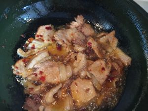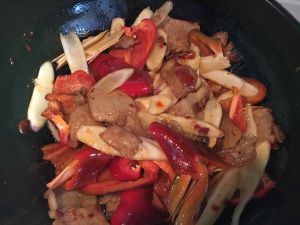肉煮好捞起切大片,入锅炒至微卷曲状(别炒太干),放醪糟(或料酒)翻炒几下,接着放豆瓣酱炒香