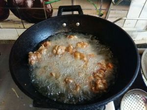 准备好备菜后开始炸鸡肉,用了生粉后,优点是炸鸡时不会溅锅,肉质滑嫩,但是和传统辣子鸡相比鸡肉没有那么香酥