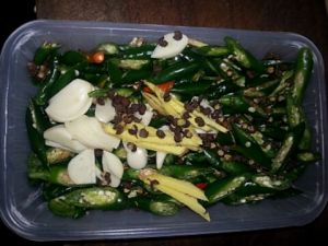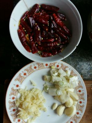 干辣椒剪小段泡水,葱花若干,蒜头剥皮拍散,小部分压成蒜蓉