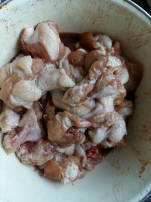 把鸡腿宰成丁,然后放少许盐,豆瓣,酱油,料酒,食用油腌好待用