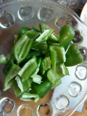 大葱绿切圈 绿线椒切圈 洋葱切粗丝 大蒜切片