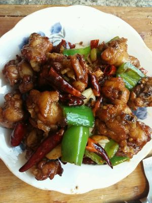 放蒜蓉入味,放白糖提鲜,装盘! 此菜在歌乐山辣子鸡基础上进行改良,原菜比较辣,老人孩子不能吃,成年人吃了也容易上火,胃痛,不敢多吃!所以我减轻了干辣椒的分量,只有原来的三分之一,加了青椒,菜没有原来那么辣又补充了维生素,老人孩子都可以吃了☺
