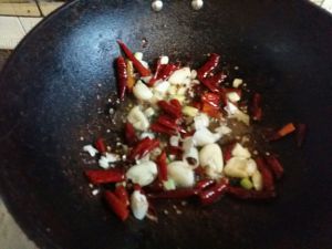 锅里倒入油,烧热后放入准备好的佐料翻炒