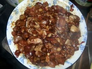 把鸡脯肉切成一厘米大小的丁,用料酒,盐,糖,老抽,淀粉扮匀腌十来分钟!