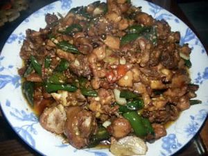 将笨鸡切块用水煮至软嫩,捞出沥干水分,锅烧热后放油,稍微多放一些,放入川椒和麻椒,变色后放入鸡块,中火煸炒至鸡肉表皮有焦黄色,放入事先备好的葱姜蒜继续煸炒,待蒜片葱丝稍焦后,放入掰成块的青椒,放入糖和盐适量,继续煸炒至青椒起皮后出锅。注:川椒、葱姜蒜一定要煸干,吃的时候可以和鸡块一起吃,味道相当霸道;另外不要放味精和鸡精酱油什么的,本身鸡肉就很鲜了,画蛇添足还不健康。