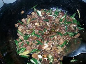 用底油加热先放入姜丝和蒜葱煸出香味,再放干辣椒,炒几下再放青椒,再炒,炒到看着差不多了就把鸡块倒进去再翻炒,炒好后加点鸡精出锅