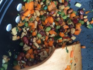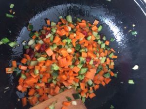 把蔬菜丁放入锅中,黄瓜丁最后放,放入酱生抽,盐,糖等调料。