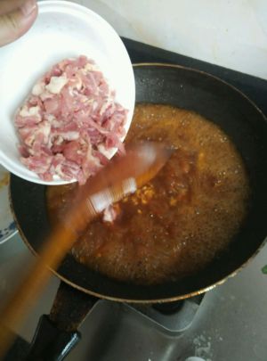 起锅时将菜放在下面打底,肉片倒在上面。放入干辣椒末。