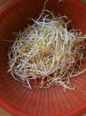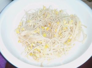 取锅,倒入少量油,把豆芽炒一下,加入少量盐,几分钟后找个大点的碗装起,等会备用!