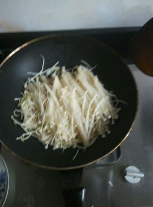 将洗净的绿豆芽先下锅翻炒再下金针菇翻炒到熟即可装碗备用