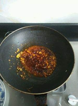 锅放油少许加入郫县豆瓣抄起香味后再放入姜蒜末。放入水少许。