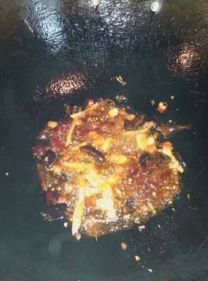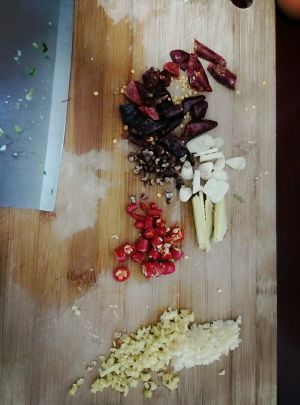 下油炒香准备的材料1,然后加一勺豆瓣炒香。要小火,干辣椒容易糊。