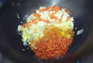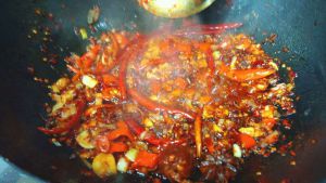 炒底料,把油锅烧热,把切好的葱姜蒜泡椒,辣椒放入炒制!
