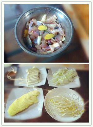 把草鱼片成薄片,用葱姜蒜盐巴腌制十分钟,腌制过程中把嫩豆腐切片,水晶芹菜切断段,土豆切片,豆芽洗净待用