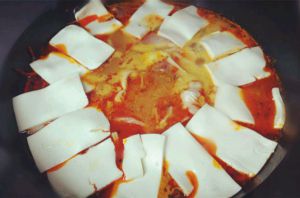 倒入鱼头汤,加入腌制的鱼,加入水晶芹菜豆芽以及嫩豆腐,最后盖上土豆片