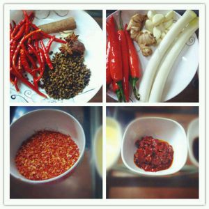 准备辅材,辣椒,葱姜蒜,辣椒酱,花椒,桂皮,八角,泡椒等