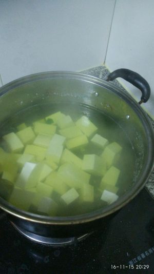 打一锅水烧开,撒两勺盐,将豆腐放进去煮熟后捞出来。放到将要陈鱼的大盆里。在将豆芽放到锅里煮熟捞出来铺到豆腐上。