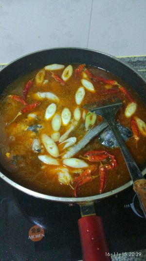 留锅底油的锅烧热撒两勺盐,撒上生姜大蒜辣椒爆香。加一勺豆瓣酱,半包麻辣鱼翻炒下。倒上之前油炸好的鱼骨鱼头后加水。