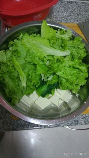 将草鱼肉片下来鱼,鱼骨鱼头剁块,鱼肉和鱼块分开加淀粉料酒腌制20分钟。嫩豆腐切大块待用,姜蒜剁碎待用,大葱切切大段待用。生菜洗净待用。