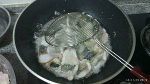 油炸鱼块至发白捞出,再油炸鱼肉至发白捞出,后把锅内的油倒出留锅底油。倒出来的油以后炒菜可以用。