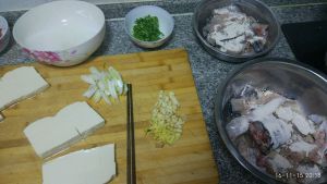 倒入盆里之后的水要满过肉和菜,所以需要多点水。再切好的大葱放上一起煮。加水的时候要多加点水。多了都可以。大火烧开后换成小火。烧开后将油炸过的鱼肉也倒上煮上20分钟入味。