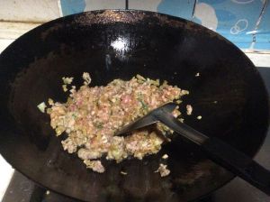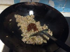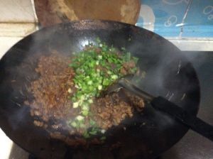 热锅,倒适量食用油,把姜蒜爆炒一下,把提前切好的加了豆粉的肉末倒入锅里炒香