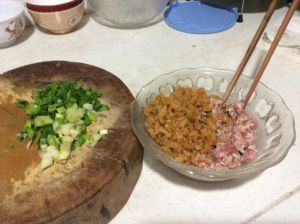 青蒜切碎,榨菜切碎放入肉末里搅拌均匀。