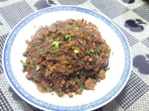 放两碗水煮粉丝,中途放盐,生抽,最后加入肉末翻炒,加点葱花装盘