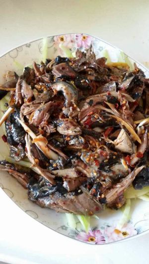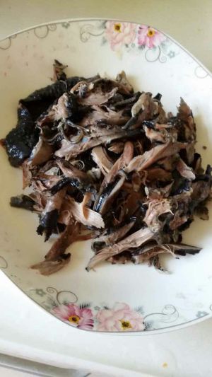 鸡腿肉一块,(我的是市场点杀的,所以比较新鲜,家里常备)放入清水煮,加几片姜和几粒花椒煮,盐,20分钟关火闷10分钟起锅撕肉