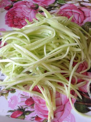 黄瓜切丝,注意丝不能切太细,会软不好吃,我的是刀刨的