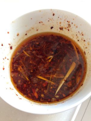 辣椒(剪小段加入芝麻后小火炒香,磨碎)加入葱丝姜丝,热油淋下去翻一下,出香味