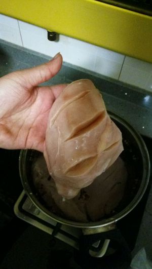 鸡胸肉处理干净后,用刀按鸡肉的文理切几道,然后放入清水中。