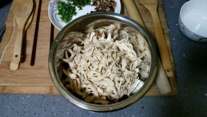 将鸡胸肉捞出,按照纹理撕开,放在一个大盆中。