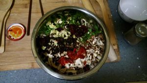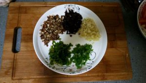 将切碎的葱、蒜、坚果、香菜、咸菜放入盆中,然后加少量的醋、鸡精、花椒粉、酱油,再加上2勺老干妈,1勺蒜蓉辣椒酱。
