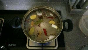 在清水中,放入花椒,大料,辣椒,香叶,料酒,葱段,少量盐。