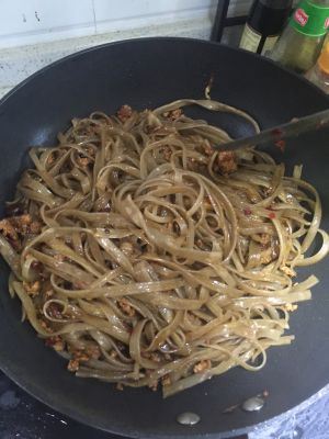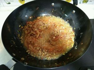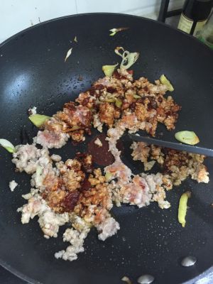 吃剩下的五花肉若干块,切碎。热油锅,放入葱姜蒜爆炒,加入五花肉沫。