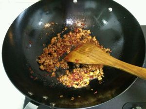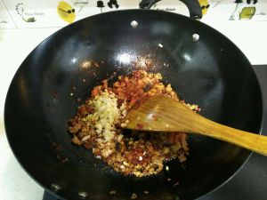 葱姜蒜下油爆香加入肉沫,酱油,郫县豆瓣翻炒