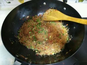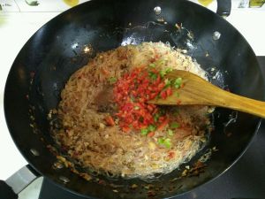 加入粉条,倒入一些水,炖五分钟,待粉条透明,加入盐鸡精,蚝油即可出锅