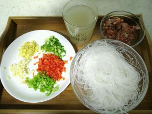 准备好食材: 粉丝用冷水浸泡半小时左右,大致有点软就可以了,捞出沥干水份,用餐剪剪成段; 猪肉洗净擦干,剁成末(猪肉最好选择梅花之类的,带一点点肥的比较香); 姜蒜切成末,青红椒切碎丁,再准备1小杯高汤;