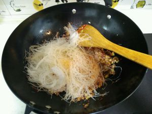 将浸泡好的粉丝放入锅里,倒入碗汁。