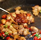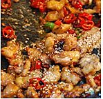 放入穿过油的鸡丁翻炒,加入白糖,淋上生抽,烹入料酒炒匀。放入四川辣酱快炒。