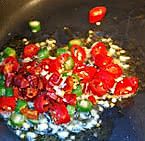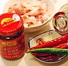 炒锅倒入少许油,加入蒜末、花椒、辣椒段炒香锅底。