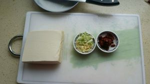 首先豆腐切成丁状,五花肉肥瘦分开切成肉丝,生姜葱蒜头干辣椒少许,当然还有老干妈豆豉酱!