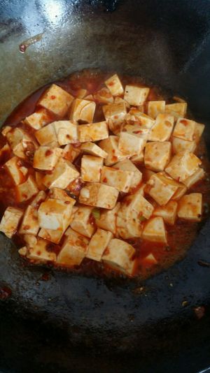 酱汁煸炒好倒入豆腐,一起煸炒,盖上锅盖,焖煮五分钟即可!
