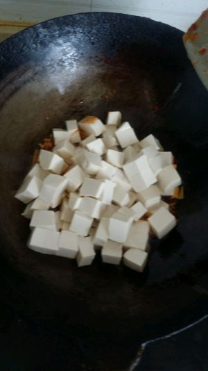然后放入豆瓣酱两勺炒香后放入豆腐块炖三分钟后轻微翻个儿。