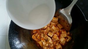 然后加入清水一大勺,中火后改小火炖,别乱翻豆腐