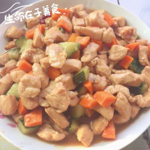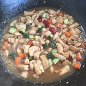 锅内放油 加入鸡肉 炒至发白 加入胡萝卜 黄瓜 干辣椒 再加入芡汁收汁